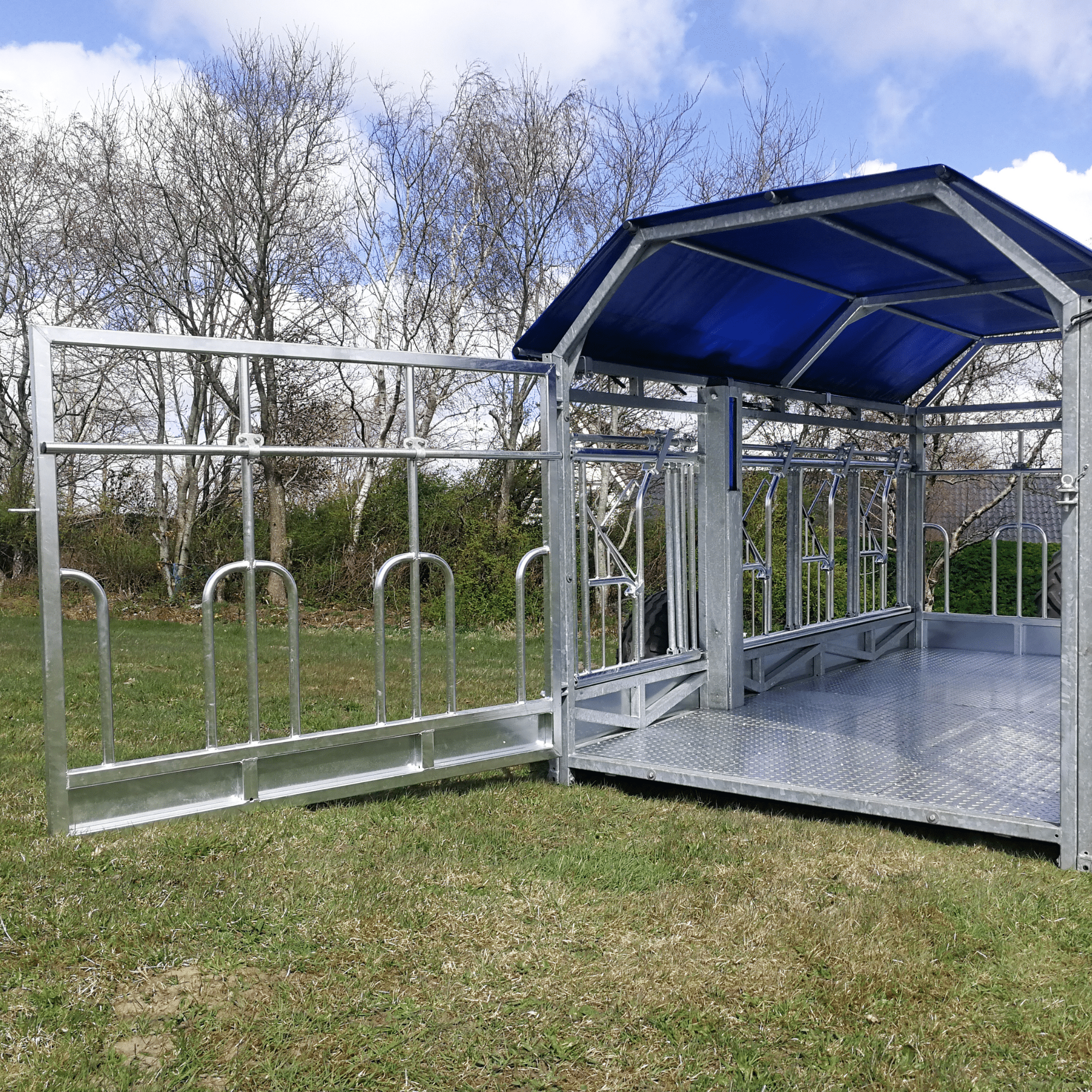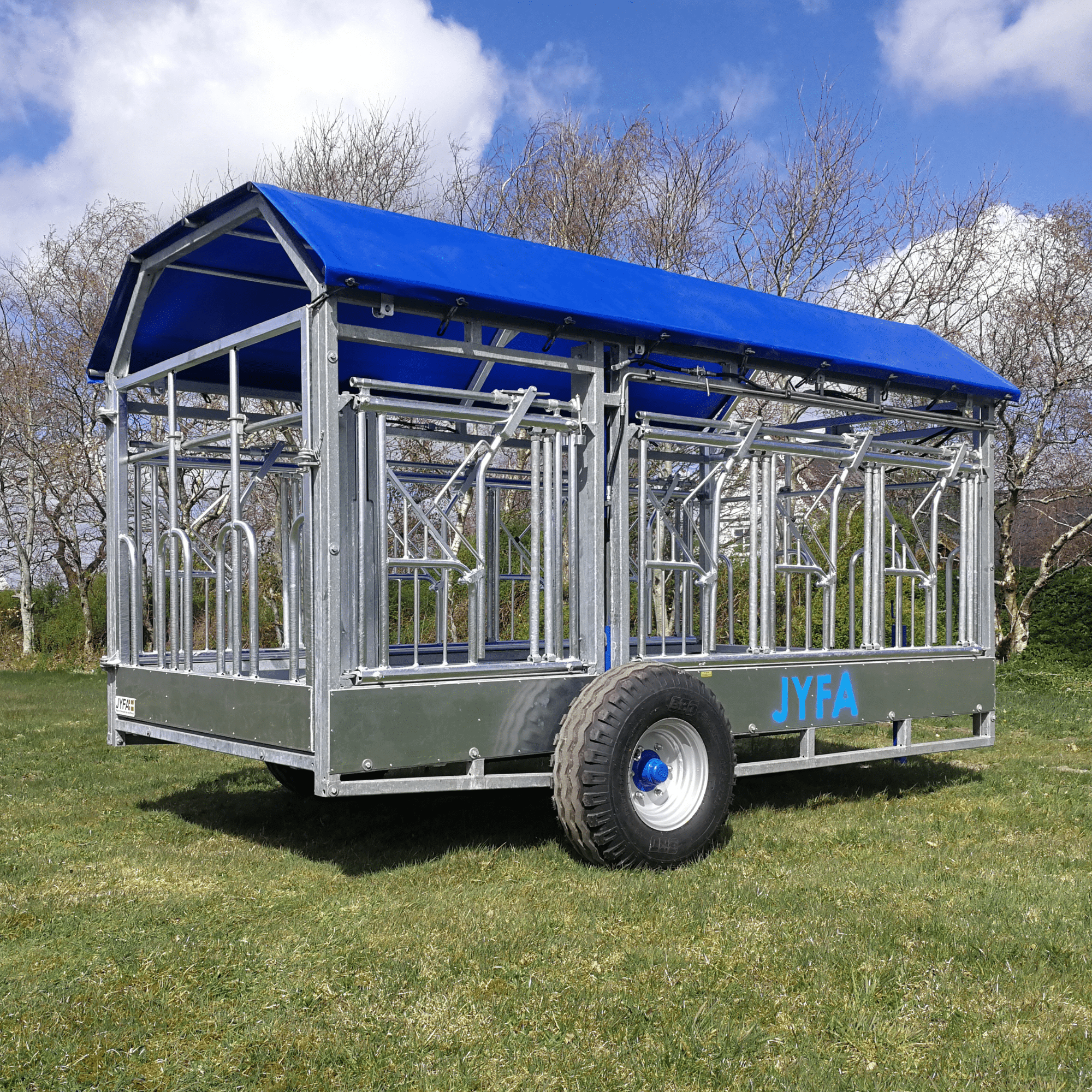The unique about this trailer is that it is equipped with two Special trap gates for Highland Cattle (1×3 and 1×1) on the left and right long side. From the selection of Extra Equipment, the customer of this trailer chose roof.