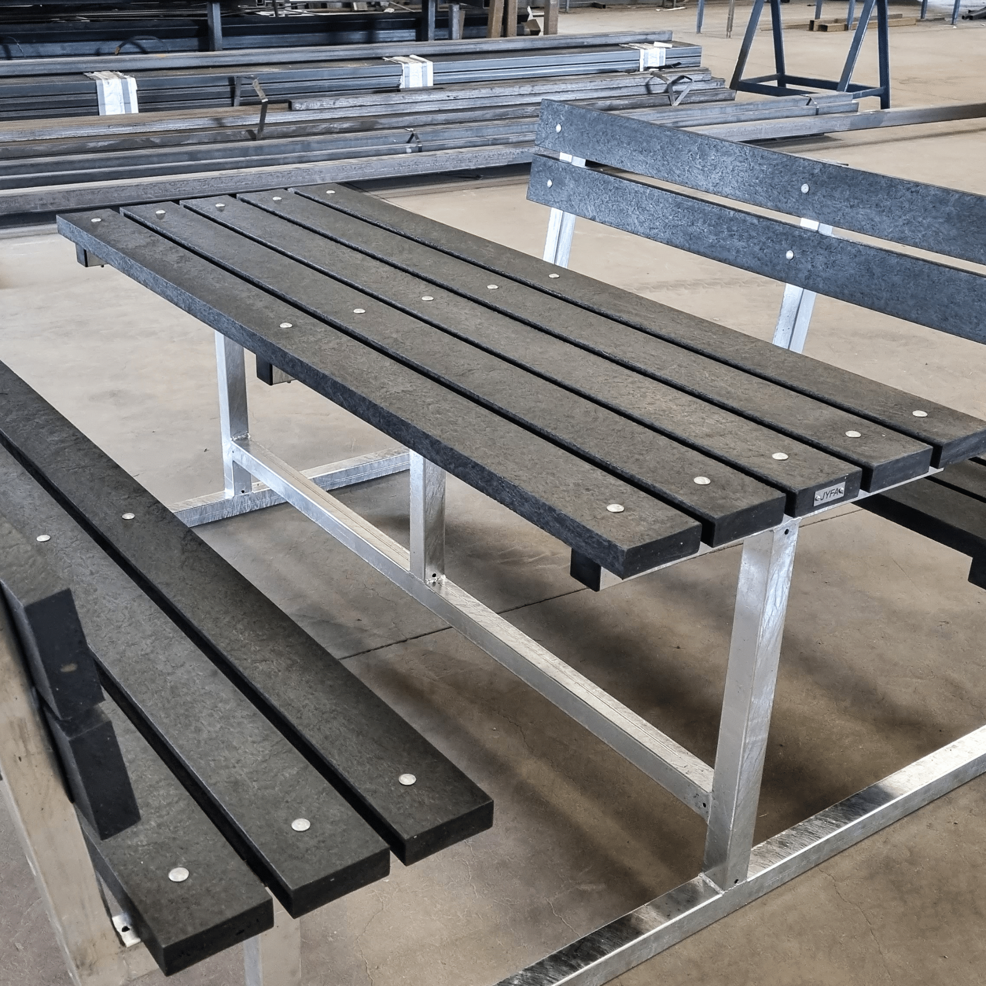 Disse bordbænkesæt er udført med smukke, vedligeholdelsesfri sorte plader i genbrugsplast og et galvaniseret understel. Bordstellets galvanisering sikrer lang holdbarhed, samtidig med at designet fremstår dekorativt og funktionelt. De vedligeholdelsesfri plader og miljøvenlige materialer gør sættet både praktisk og bæredygtigt.