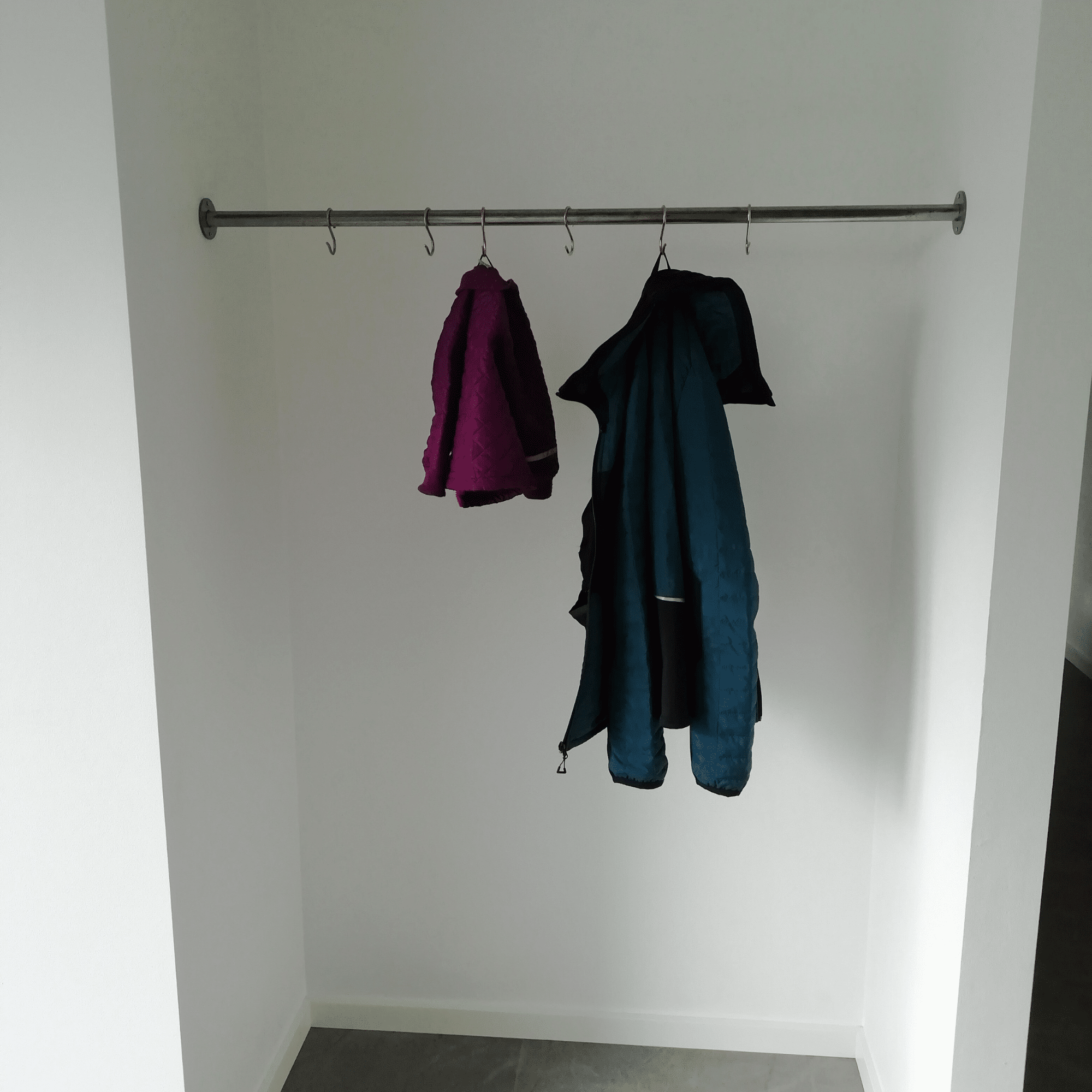 Garderobestangen er specialfremstillet i råt jern, så den passer perfekt ind i et udhak i rummet. Den kombinerer funktionalitet med et råt, industrielt udtryk, der giver karakter til rummet.