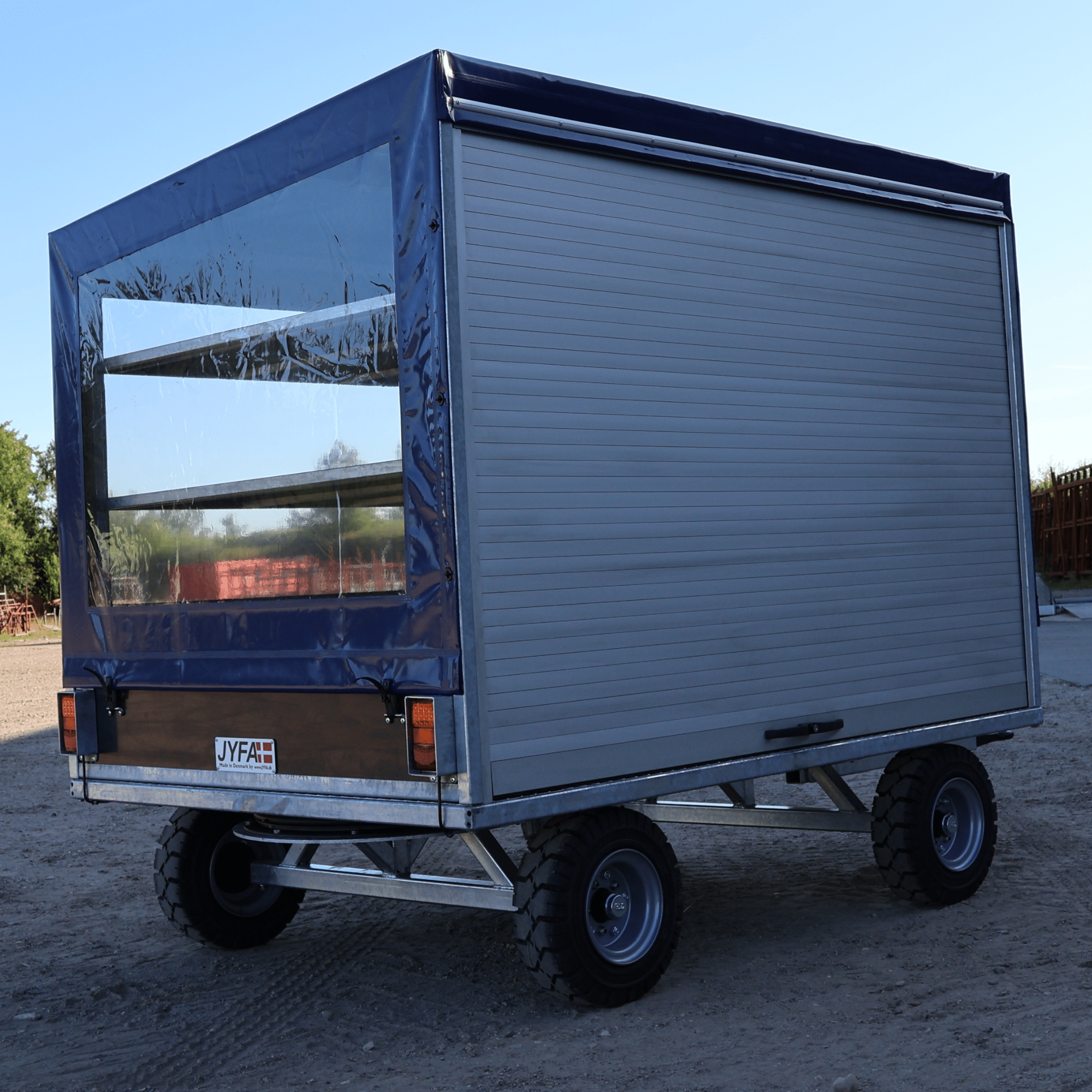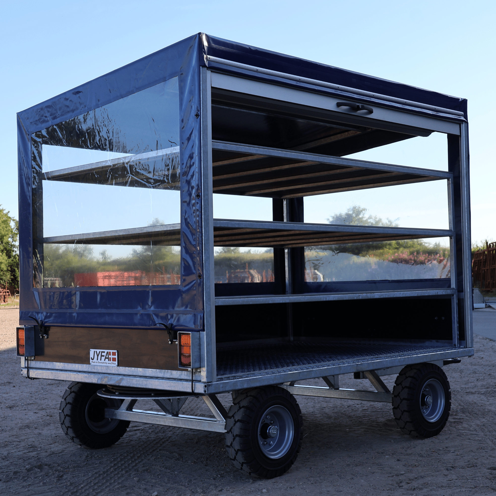 Denne smarte produktionsvogn er specialfremstillet præcis efter kundens ønsker og behov. Alle sider – undtagen fronten – er beklædt med blå presenning med vinduer, så medarbejderne nemt kan se, hvilke dele der befinder sig i vognen.