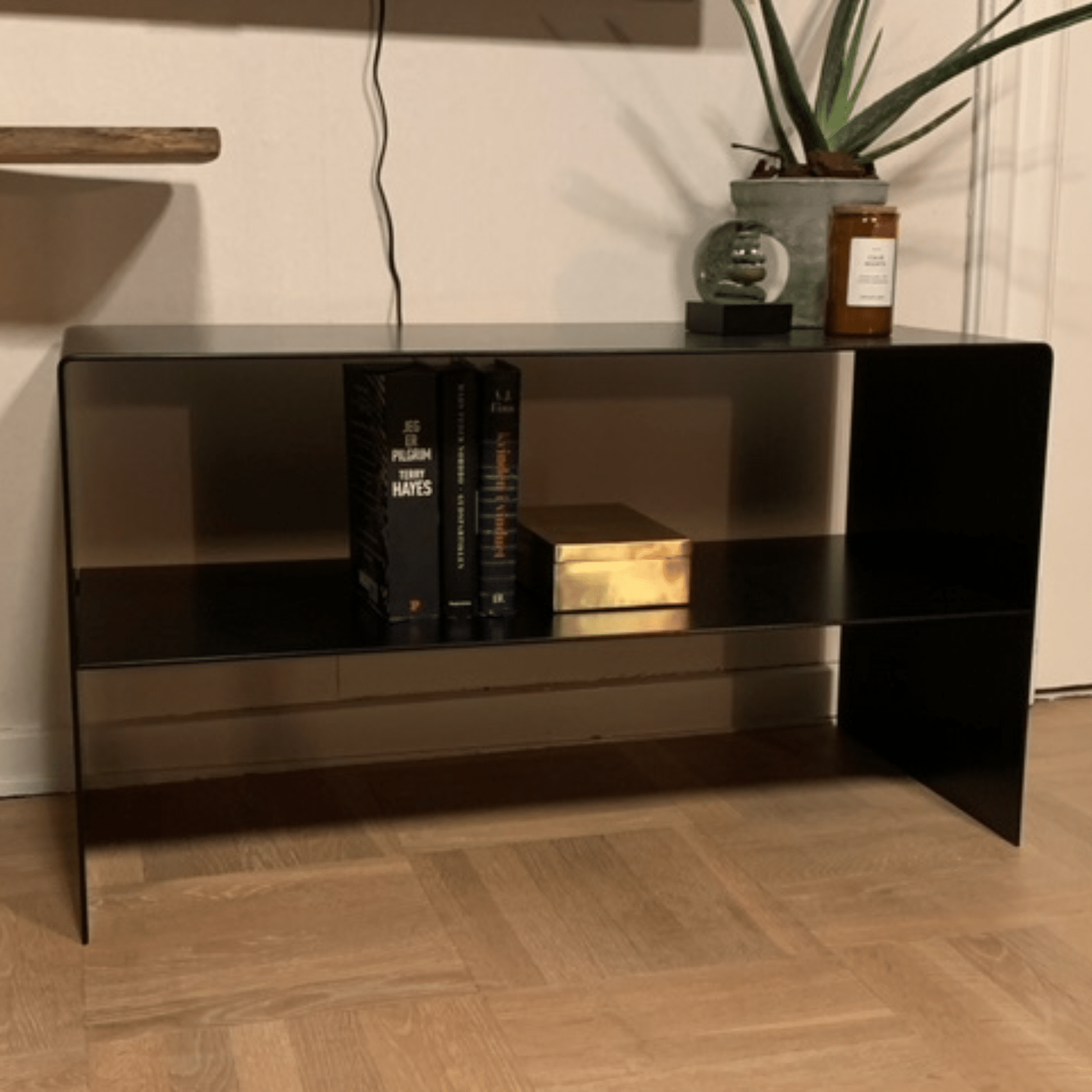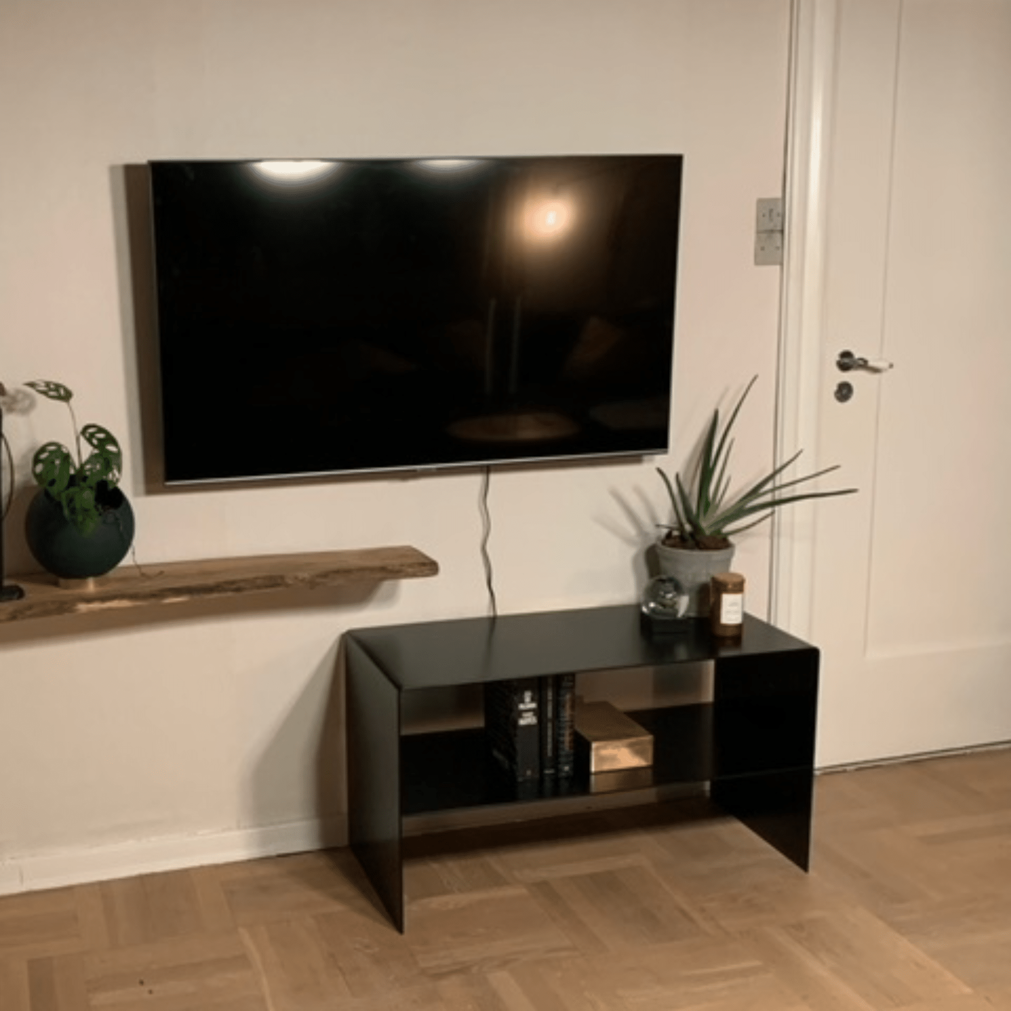 TV-bordet er fremstillet efter kundens eget design og udført i 5 mm stål. Den sorte strukturlakering giver bordet en slidstærk og holdbar overflade, samtidig med at den fremhæver det rå, industrielle udtryk. Et elegant og personligt møbel, der kombinerer funktionalitet med stilfuldt håndværk.